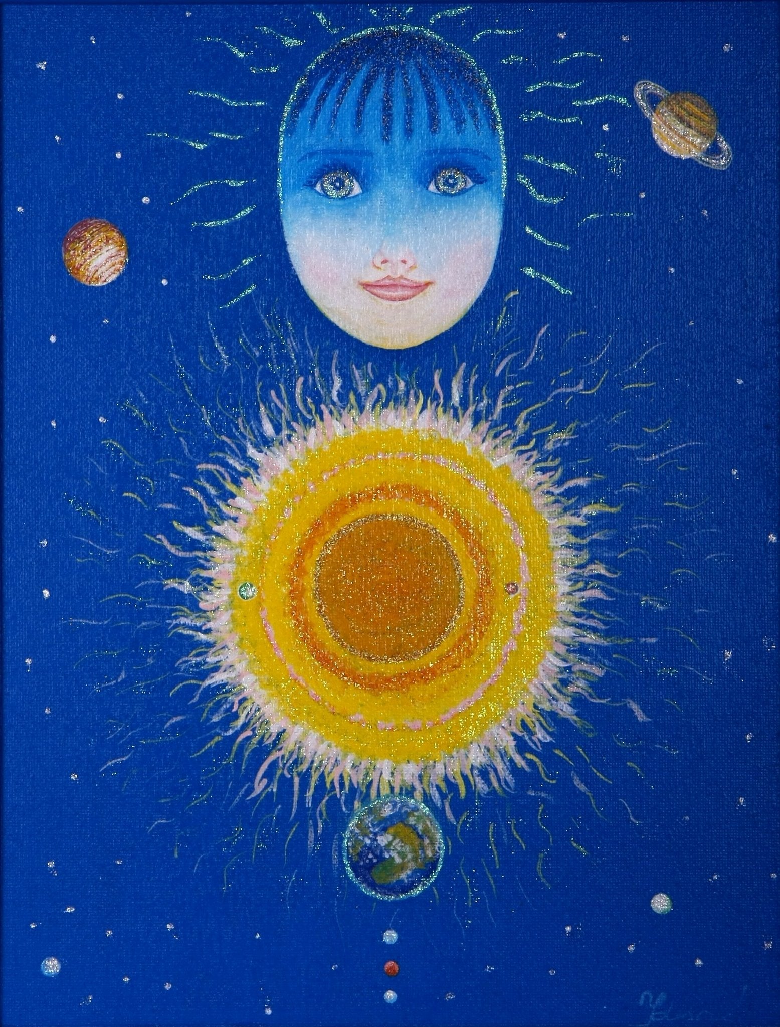 V dolnej časti sa objavuje Zem. Je priamo prepojená so slnečným centrom, čo zdôrazňuje myšlienku, že život na Zemi je neustále vyživovaný a udržiavaný tvorivou silou zdroja. Planéty a hviezdy v pozadí rozširujú význam obrazu do kozmického kontextu – stvorenie ako univerzálny dej.