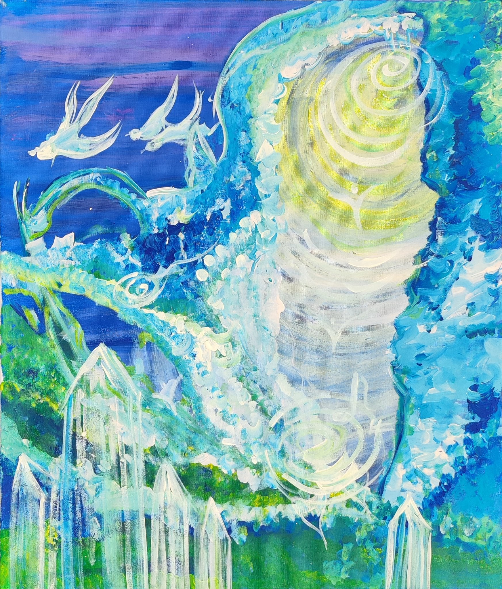 V dolnej časti obrazu sa objavujú kryštalické tvary a vertikály, ktoré pôsobia ako stabilné body v krajine. V kontraste s nimi sú v hornej časti naznačené vtáčie siluety – symbol voľnosti, ľahkosti a presunu. Celá kompozícia tak pracuje s rovnováhou medzi stabilitu a pohybom.