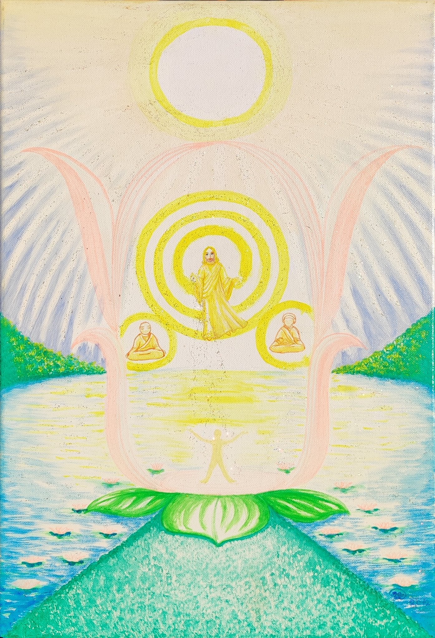 - Lotosový kvet: Obrazu dominuje veľký rozkvitnutý lotos, z ktorého vyrastajú jemné ružové línie pripomínajúce ramená alebo okvetné lístky, ktoré objímajú a chránia celú scenériu. Lotos je symbolom znovuzrodenia a duchovného rozkvetu z bahna pozemskosti do svetla poznania.
