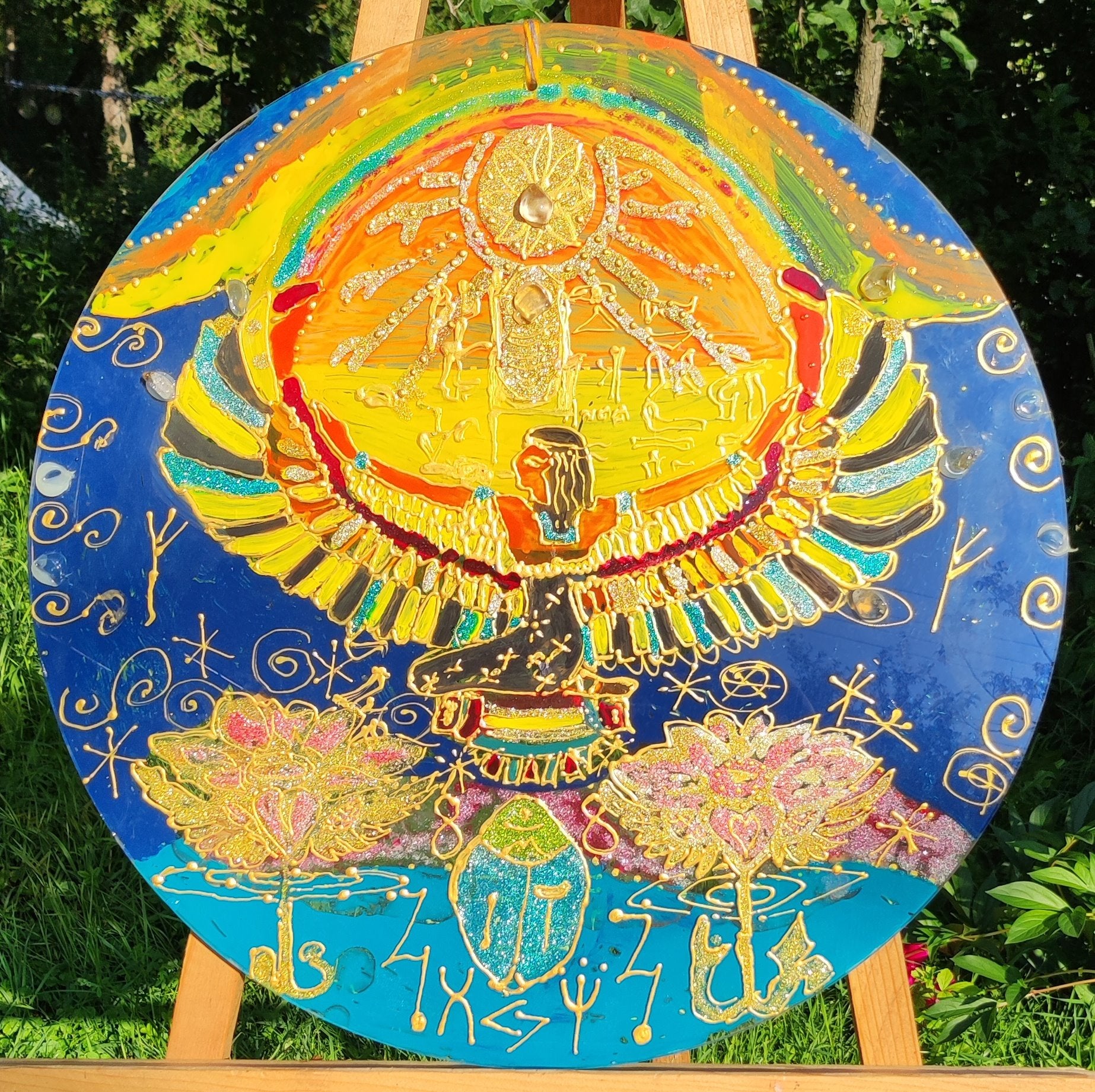 Horná časť obrazu je zalitá zlatou a oranžovou farbou – symbolizuje zdrojové svetlo, vedomie a vyšší poriadok. Centrálne slnko s lúčmi funguje ako aktivačný bod, z ktorého energia zostupuje nadol.