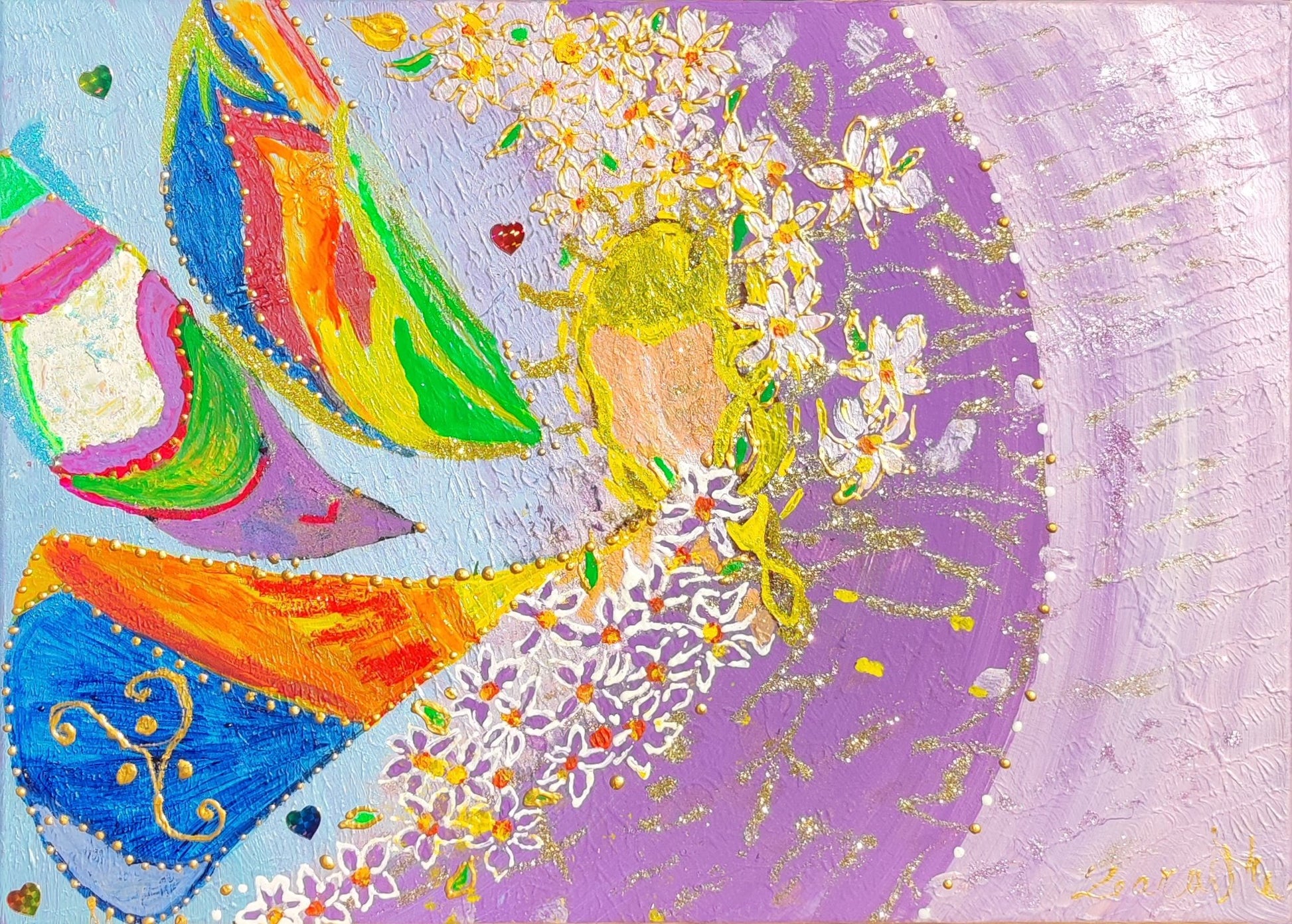 Použitie aplikovaných bodov, metalických farieb a štruktúr robí obraz živým – mení sa v závislosti od svetla a uhla pohľadu.